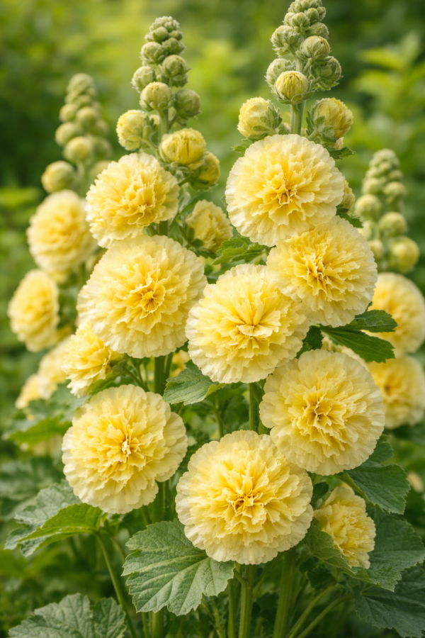 De Alcea rosea Chater’s Golden Yellow blijft een tijdloze keuze in elke tuin, ongeacht de stijl.