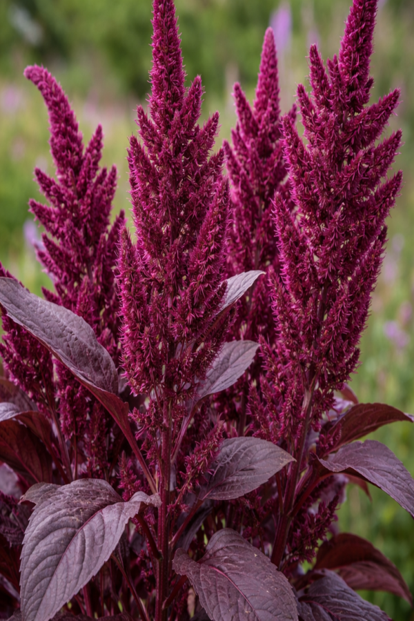 De plant staat bekend om zijn diep bordeauxrode bloemaren, die elegant boven het auberginepaarse blad uitsteken. Tussen de pluimen glanzen dieprode bloemen en chartreusegroene amaranthen in de achterborder, waardoor een visueel dramatisch en rijk tuinbeeld ontstaat. Deze combinatie van kleuren maakt Amaranth ‘Oeschberg’ ideaal als hoogte- en kleuraccent in zomerborders.