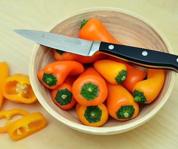 Выдатны аранжавы перац для перакусу. Падоўжаныя плады даўжынёй усяго 5 см, выключна салодкія і амаль без костачак на раслінах вышынёй 60 см.