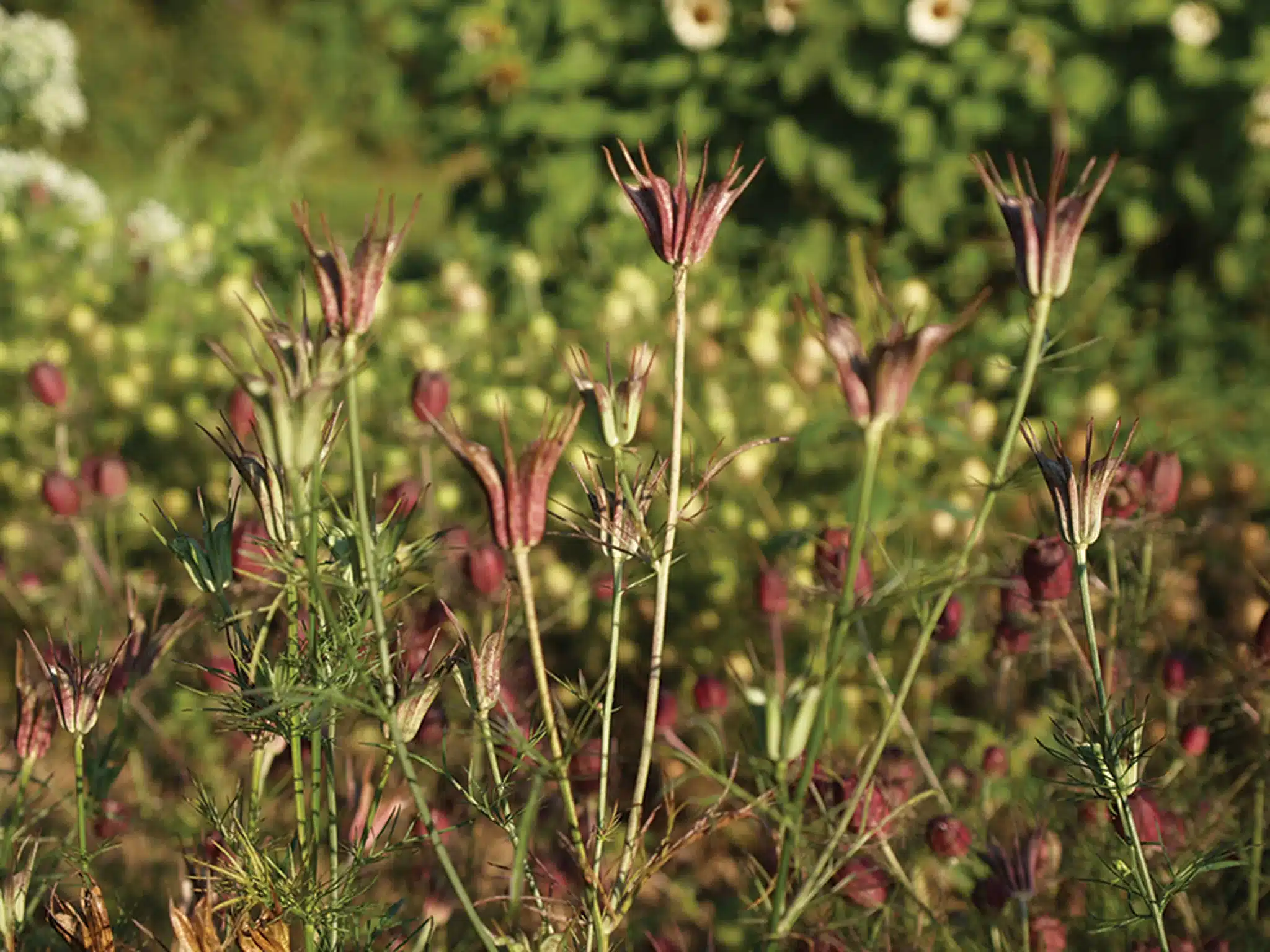 Нігела «Трансформер» дадае цікавую тэкстуру сваімі непаўторнымі формамі кветак і вертыкальнымі насеннымі струкамі.