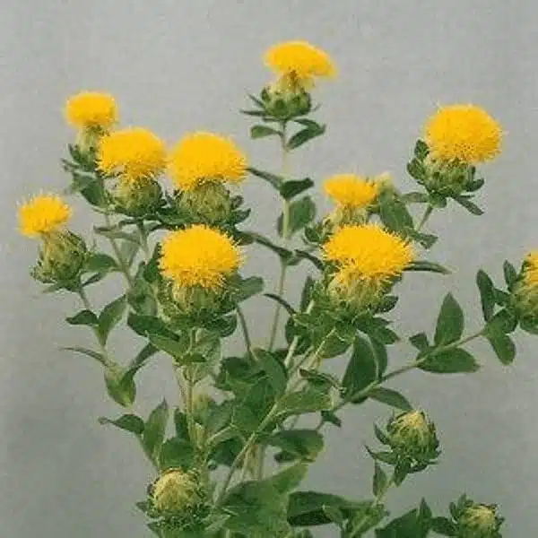 Carthamus Yellow Grenade мае кветкі, падобныя на чартапалох, з унікальным жоўтым колерам і свежым зялёным лісцем.