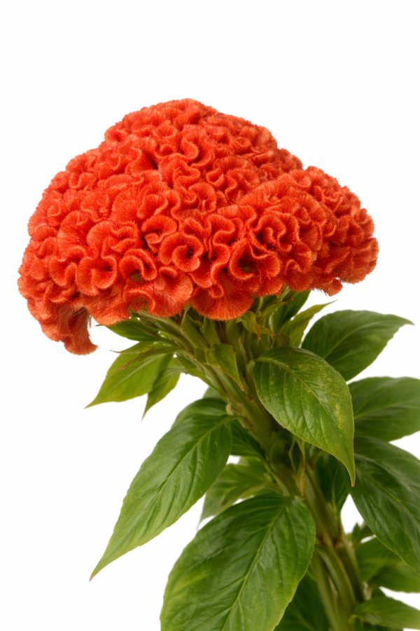 Энергічны, цёпла-аранжавы пеўневы грэбень з буйнымі, шаровіднымі кветкавымі галоўкамі і выключна раўнамерным ростам.