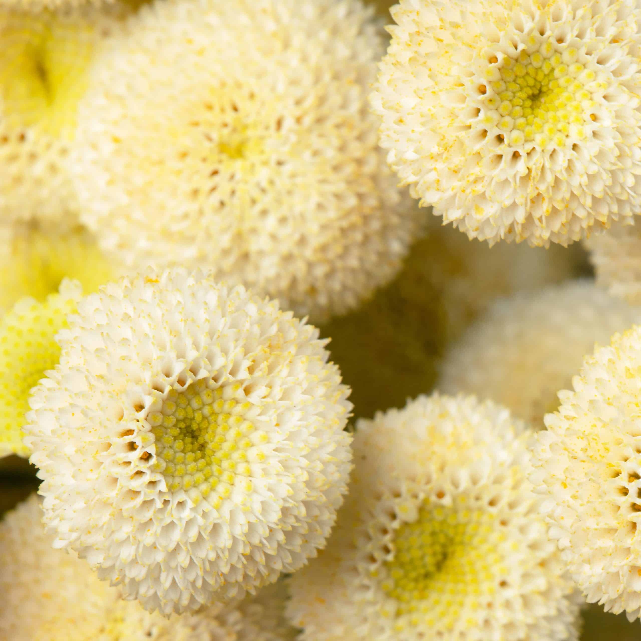 Танацэтум Ліма мае трывалыя, тонка складзеныя сцеблы з мноствам белых паўсферычных кветак.