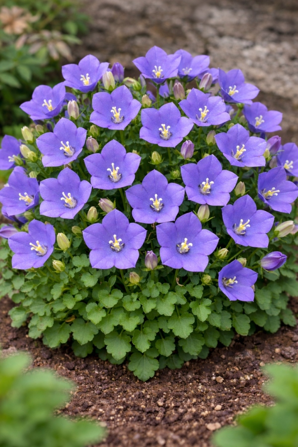 De bloemen groeien net boven het blad uit, waardoor de plant een nette, kussenvormige uitstraling behoudt. Met een hoogte van ongeveer 20 tot 30 cm blijft deze Campanula compact en overzichtelijk.