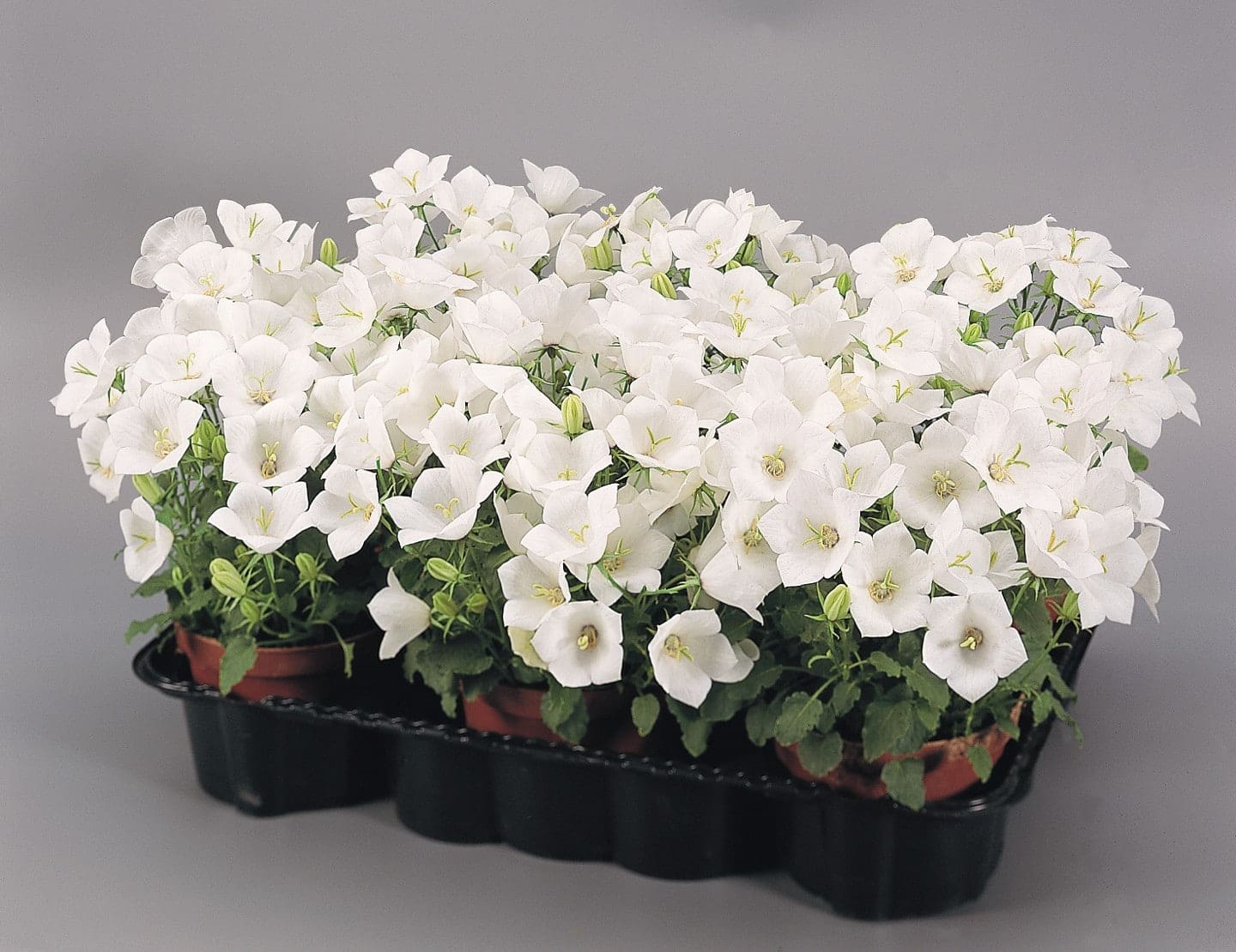 Een vaste plant met een overvloed aan vrolijke, klokvormige bloemen in helder wit.