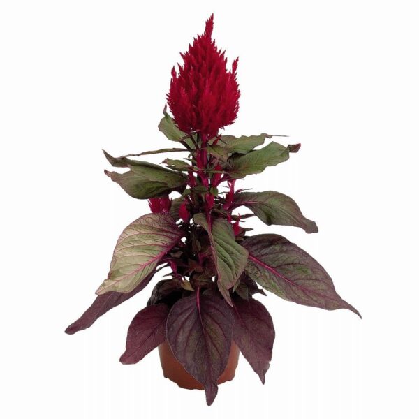 Donker, bronskleurig loof. Heldere rode bloemen als contrast.