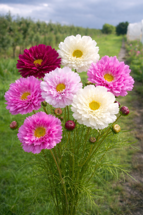 De Cosmos bipinnatus ‘Double Click Mixed’ is de ultieme droom voor elke tuinliefhebber die houdt van variatie en overvloed. Deze mix biedt een spectaculair palet aan volledig dubbele en half-dubbele bloemen in de tinten van zuiver wit en zachtroze tot diep karmozijnrood, allemaal met de karakteristieke “pompon”-vorm.