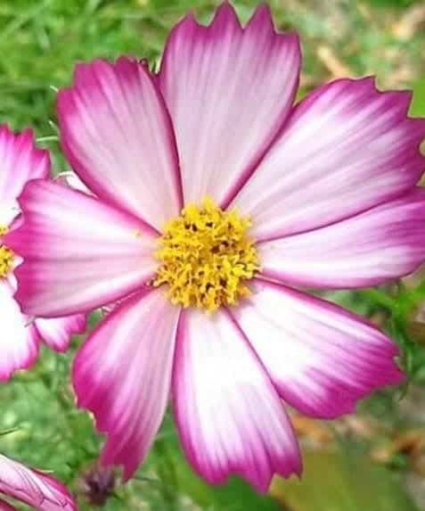 Cosmos Sensation Picotee is een opvallende tweekleurige cosmos met grote bloemen die wit tot licht zijn, met roze randen en een rijke frambozenrode kern.