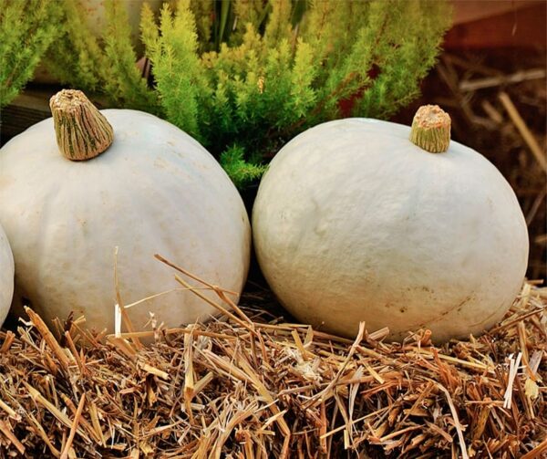 Mooie, witte Halloweenpompoen. Vruchten van ongeveer 15–20 cm in diameter. Ook uitstekend geschikt voor de keuken.
