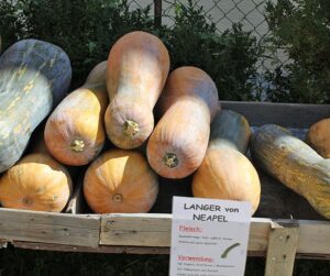 Zeer mooie vruchten van ongeveer 2–3 kg, donkergroen en licht gespikkeld. Bleek rendabel in de slechte weerjaren.