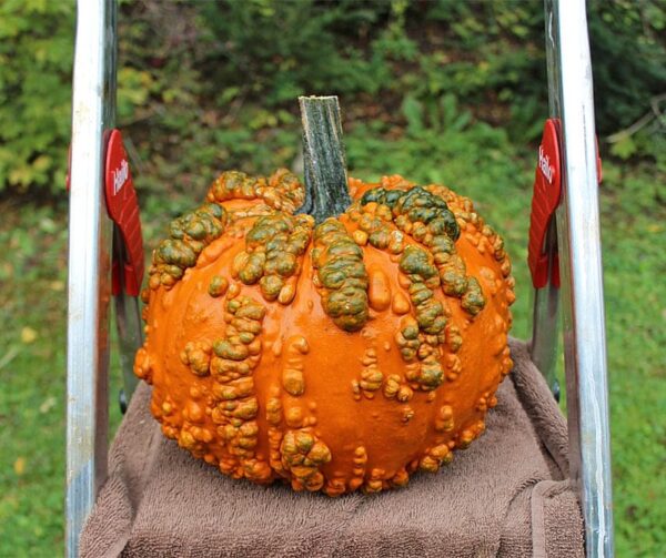 Sterk knoestige, zeer ronde Halloween-variëteit met een gewicht van ongeveer 3,5 tot 5,5 kg. Niet geschikt voor consumptie.