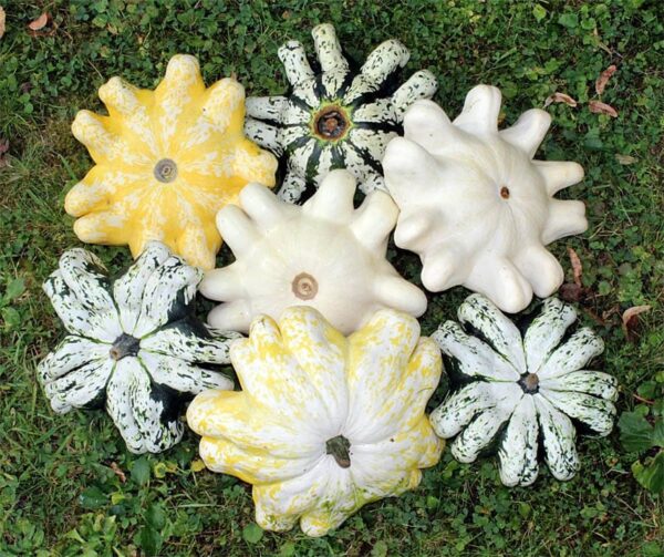 Zeer decoratief formulesmengsel van zuiver wit, wit met gele strepen en wit met groene strepen. De rijpe vruchten zijn 12–20 cm groot.