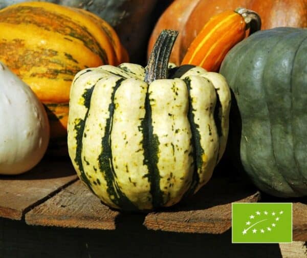 Bekende, groen-witte variëteit, zeer decoratief en uitstekende pompoen, ca. 600 g.