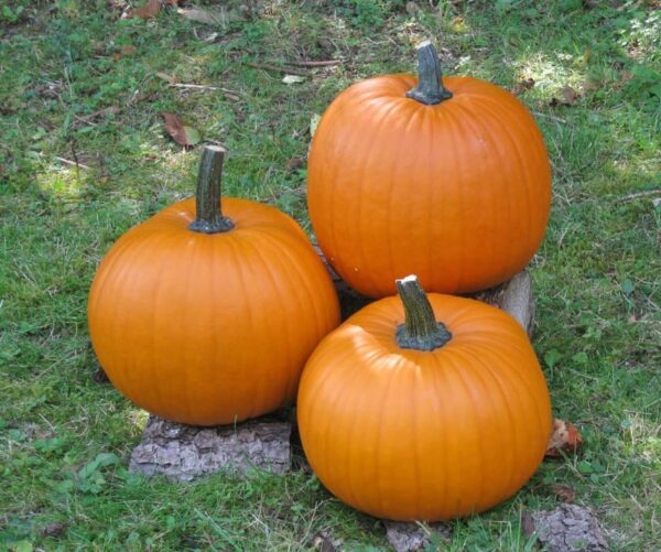 Ronde pompoenen, die ongeveer 3-4 kg wegen. De meeldauwtolerante planten.