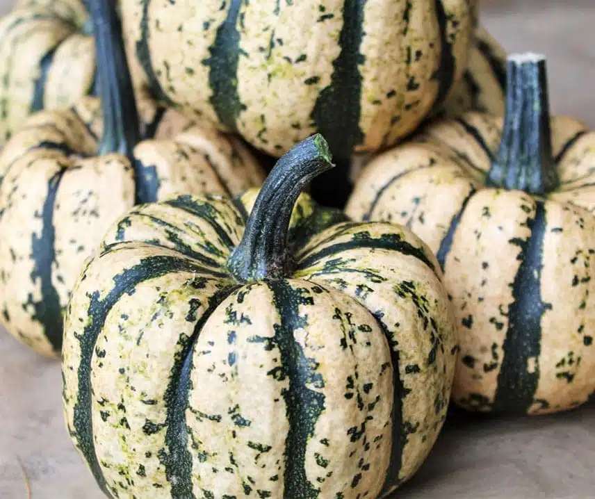 Ongewoon mooi gekleurde Sweet Dumpling, die naar onze mening deze naam onterecht draagt. Het vruchtgewicht ligt rond de 600 gram. De vruchten zijn goudbruin van kleur met groene strepen.
