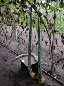 Teelt: Lagenaria groeit goed in warme klimaten en heeft klimmende ranken met grote bladeren en witte bloemen.
