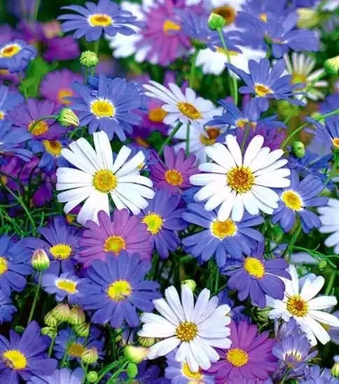 Sie bringt eine Fülle wunderschöner Gänseblümchenblüten hervor, deren Farben von hellem Lila-Rosa und Hellblau-Lila bis hin zu tieferem Rosa-Lila und Violett reichen, oft mit gelbgrüner Mitte, die mit der Zeit bronzebraun werden kann.