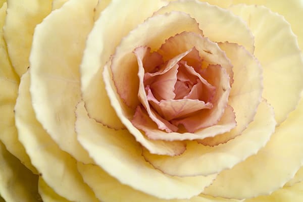 Brassica Empire Alexandra hat cremeweiße, runde Blätter mit grünen Außenblättern und – in einem späteren Stadium – einer hellrosa Röte im Kern.
