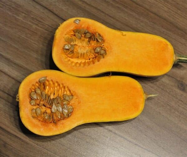 Ein sehr schöner, gleichmäßig geformter Butternusskern der dunklen Sorte, der deutlich mehr carotinreiches Fruchtfleisch enthält als die hellen Sorten.
