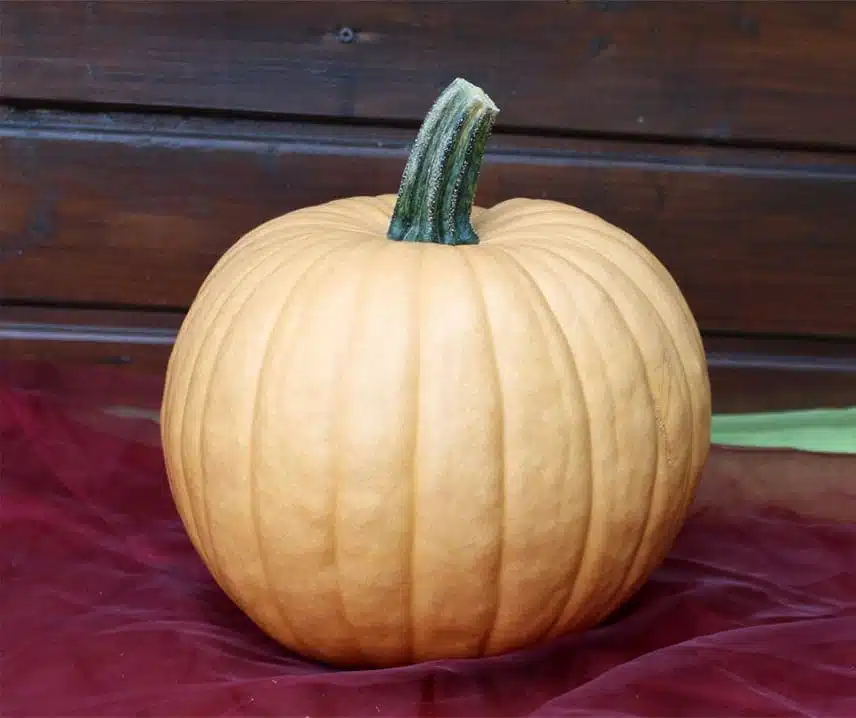 Wunderschön geformter Kürbis in Karamellfarbe.