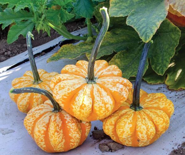 Die Früchte haben eine charakteristische Form, die an Patisson-Kürbisse erinnert, mit einer leicht abgeflachten Oberfläche und dezenten Rippen. Ihre Farbe ist eine lebendige Kombination aus Gelb mit orangefarbenen Streifen und Punkten, die einen fröhlichen und sonnigen Eindruck macht. Mit einem Gewicht von etwa 700 bis 900 Gramm sind die Kürbisse kompakt und handlich und eignen sich ideal sowohl für Dekorationszwecke als auch zum Kochen.