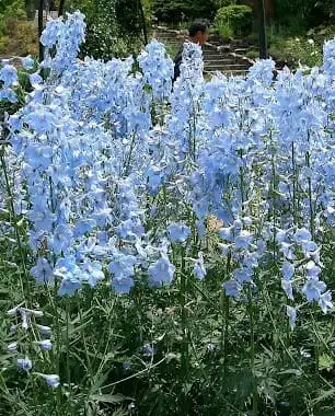 Delphinium belladonna Clivedon Beauty ist ein eleganter, einfach blühender Delphinium, hellblau mit charakteristischen spitzen Sporen.