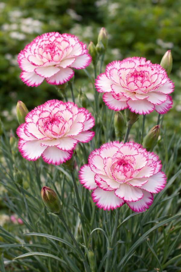 Die Chabaud Benigna bildet gefüllte, gefranste Blüten mit einem Durchmesser von 4–5 cm, wobei ein geringer Anteil an Blüten ungefüllt ist. Die Blütenblätter haben eine weiße bis cremefarbene Basis und einen rosa Rand, wodurch ein eleganter und markanter Kontrast entsteht. Diese Blüten verströmen einen intensiv würzigen, charakteristischen Duft, typisch für die Chabaud-Sorte, und eignen sich daher perfekt für duftende Sträuße und Gestecke, die Ihre Kunden begeistern werden.