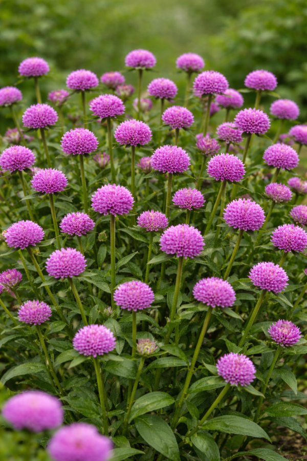 Kugelförmige Blütenköpfe – charakteristisch für Kugelamaranth, elegant und dekorativ.