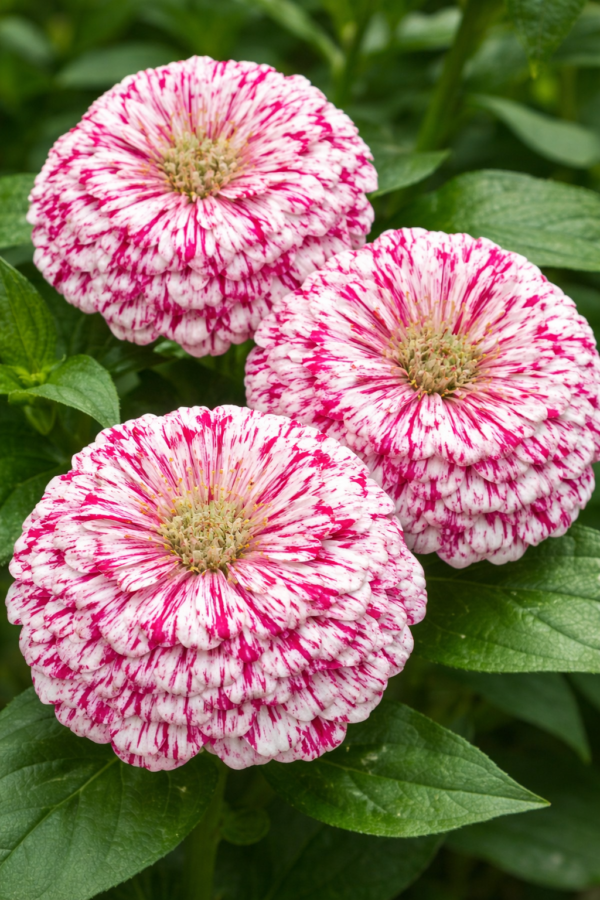 Was die Zinnie 'Peppermint Stick' so besonders macht, ist der unvorhersehbare, fast handgemalte Effekt ihrer Blütenblätter. Die Streifen und Farbtupfer variieren von Blüte zu Blüte in Intensität und Farbe und verleihen jeder Pflanze einen lebendigen und verspielten Charakter. Die Blüten sind groß, rund und üppig, mit mehreren Blütenblattschichten, die an eine Dahlie erinnern. Die kontrastierenden Farben wirken sowohl im Garten als auch in der Vase atemberaubend.