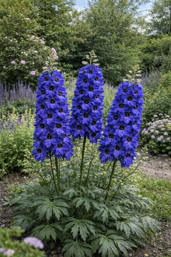 De diepe kleur maakt deze Delphinium ideaal voor tuinen waar sterke contrasten en rijke tinten gewenst zijn. Het donkere hart geeft de bloemen een bijna fluweelachtige uitstraling.