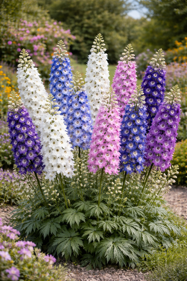 Delphinium grandiflorum ‘Magic Fountains Mixture’ is een kleurrijke en veelzijdige samenstelling van compacte riddersporen in diverse tinten blauw, wit, lavendel, lilac-rose en diepblauw. Deze mix uit de populaire Magic Fountains-serie combineert verschillende bloemkleuren mét contrasterende “bee”-harten, wat zorgt voor een levendig en speels effect in de tuin én in boeketten.