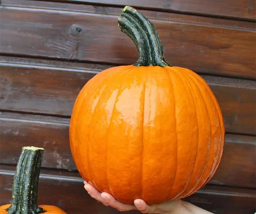 A striking, somewhat teardrop-shaped pumpkin, beautifully ribbed and dark orange. The fruits weigh around 5 kg and are very durable.
