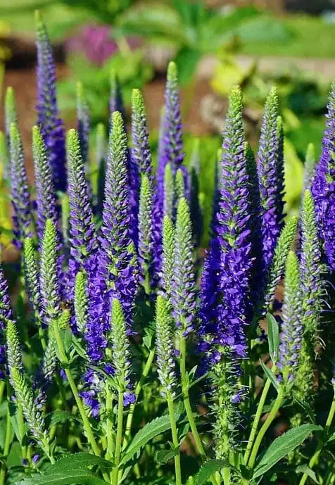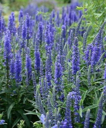 Basal branched plants with upright stems and slender spikes of small blue flowers in elegant, pointed flower heads.