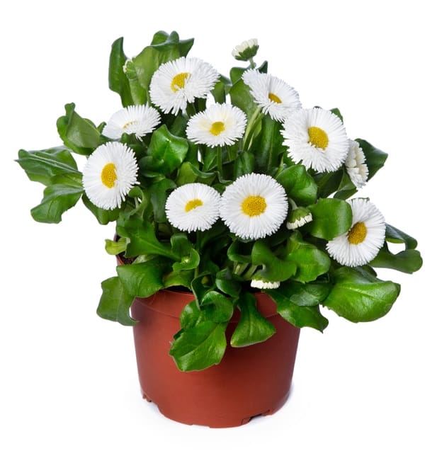 Bellis Mars White tiene flores blancas semidobles con un corazón amarillo y hojas estrechas de color verde oscuro.