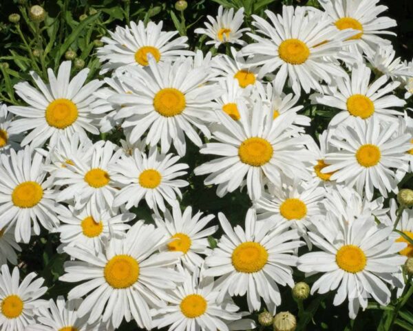 Las margaritas Shasta prefieren pleno sol, pero toleran la sombra ligera, aunque la floración puede verse reducida con poca luz. Es importante regarlas regularmente, especialmente durante los períodos de sequía, pero una vez establecidas, la planta es bastante tolerante a la sequía.