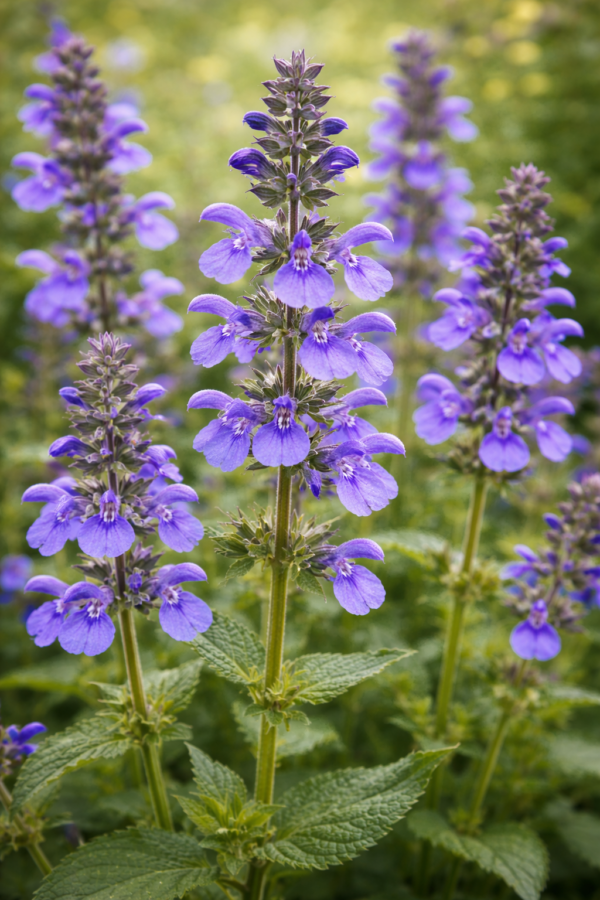 La Salvia pratensis florece de mayo a julio con largas espigas florales cubiertas de una rica variedad de flores en forma de labio. Su color varía del azul brillante al morado oscuro, según el cultivar. La planta suele alcanzar una altura de 40 a 70 centímetros y posee hojas robustas y ligeramente peludas que crecen en roseta. Su porte vertical añade estructura y verticalidad a los bordes y prados de flores silvestres.