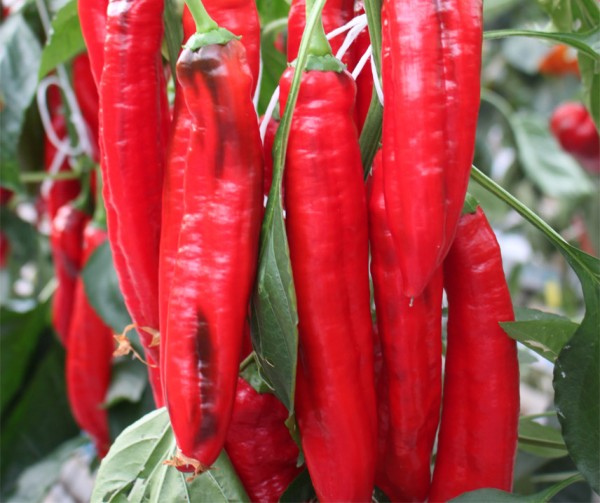 Cette variété hybride produit de longs fruits rouges à la saveur sucrée et aromatique excellente.