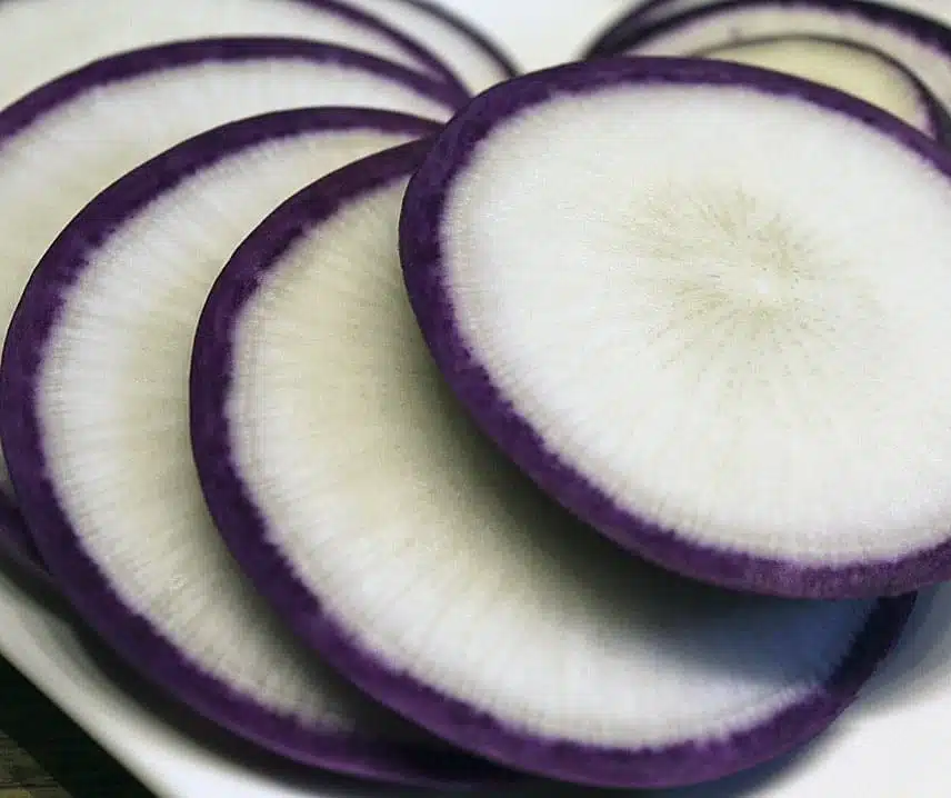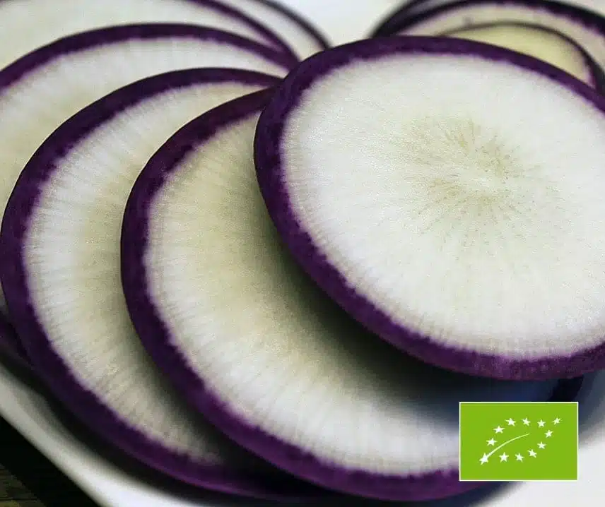 Une spécialité de radis pour la récolte d'automne. De forme conique, peau bleu-violet, cœur blanc pur.