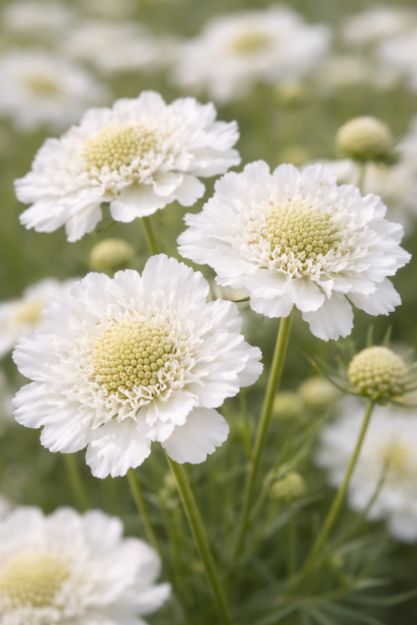 Scabiosa caucasica appartient à la famille des Caprifoliacées. Le cultivar Perfecta Alba se distingue par :