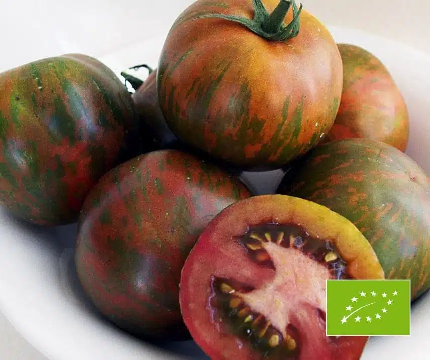 Tomate aromatique, foncée et rayée.