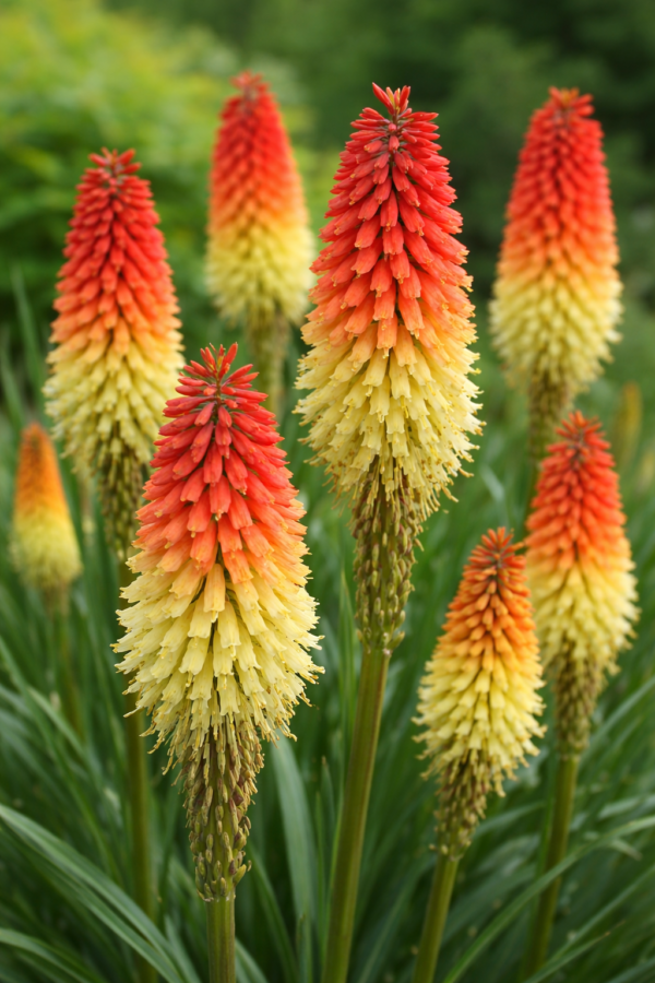 Kniphofia uvaria Royal Castle Hybrids, ook wel bekend als vlammenbloem, is een opvallende vaste plant die bekendstaat om zijn lange, verticale bloemtrossen in warme rood-oranje tinten. Deze hybriden zijn geselecteerd vanwege hun compacte groei, uitbundige bloei en langdurige decoratieve waarde, waardoor ze perfect zijn voor borders, rotstuinen, solitaire aanplant en gemengde beplantingen.