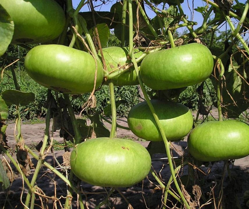 De plat-ronde vruchten, ongeveer 20-25 cm in diameter, zijn lichtgroen.