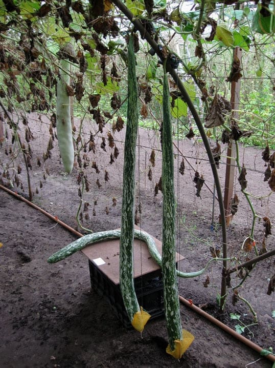 Lagenaria groeien zeer snel en de mooiste vruchten krijg je als je de ranken langs een hek of pergola leidt.