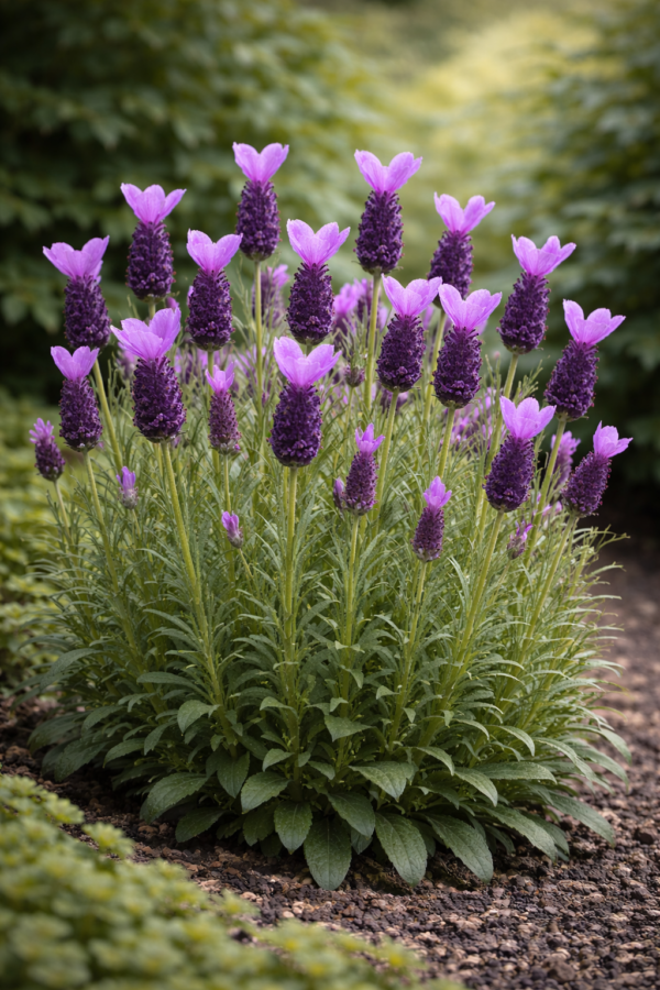 De bloemen zijn intens paars van kleur en hebben de kenmerkende ‘vlindertoppen’ aan de bovenkant van de bloemaren, wat de plant een uniek en exotisch uiterlijk geeft. Deze opvallende bloemstructuur onderscheidt Lavandula stoechas van traditionele Engelse lavendel en trekt extra aandacht in elke tuin.