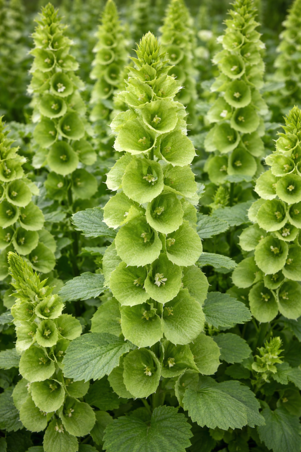Bloemen: Kleine, witte bloemen verborgen binnen opvallende heldergroene, trompetvormige kelkbladen, die samen de iconische “Bells of Ireland” vormen.