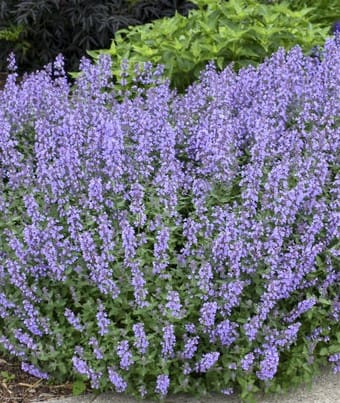 Nepeta racemosa, de populaire kattenkruid, vormt brede pollen met kleine, geurige grijze bladeren en draagt kleine witte buisvormige bloemen met lipjes.