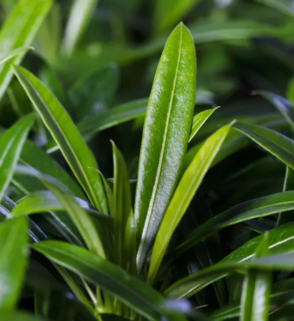 De stam wordt getooid door lange, slanke, donkergroene bladeren met een opvallende witte bladnerf. achypodium lamerei groeit iets sneller dan Pachypodium geayi.
