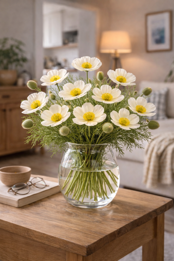 ‘Bianco’ produceert stevige, rechtopstaande stelen van 25–35 cm, die bloemen lang en elegant in een vaas houden. De bloemen zijn groot, enkel of licht gevuld en helder wit, met een zijdeachtige, delicate textuur, waardoor ze een elegante en frisse uitstraling geven in bloemstukken.