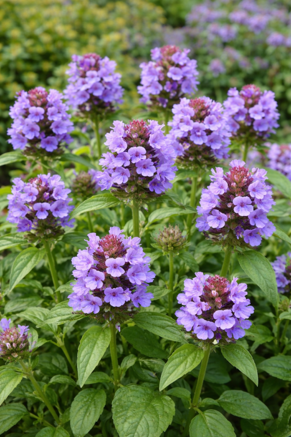 Compacte, bossige groei: Prunella grandiflora Violet-Blue vormt een dicht, laagblijvend tapijt van groen blad met slanke bloemstengels, ideaal als bodembedekker of borderplant.