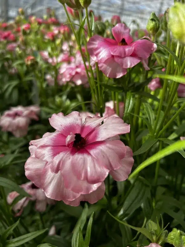 Deze ranonkel onderscheidt zich door haar unieke kleurverloop en verfijnde uitstraling. De bloemblaadjes tonen een subtiele overgang van lichtroze naar paarsachtige tinten, met een intens donkerroze centrum dat direct de aandacht trekt. Elke steel draagt gemiddeld vijf tot acht bloemen, wat zorgt voor een volle en weelderige presentatie.